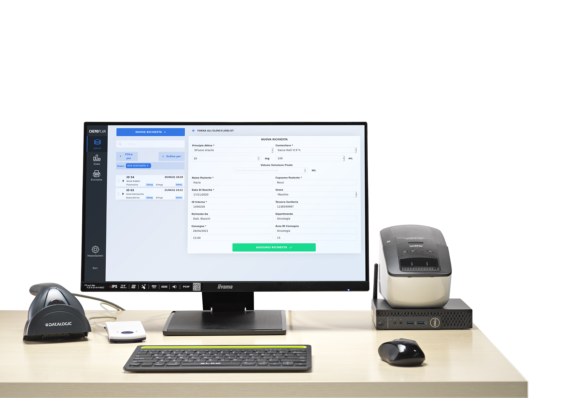 ChemoMaker+ is wireless connected to a computer, which allows the operators of the hospital pharmacy to organize the preparation activity according to the prescriptions received from the oncology departments. All materials are identified by barcodes and RFID tags for maximum safety. Multiple automatic checks assure high accuracy and safety of the final product.